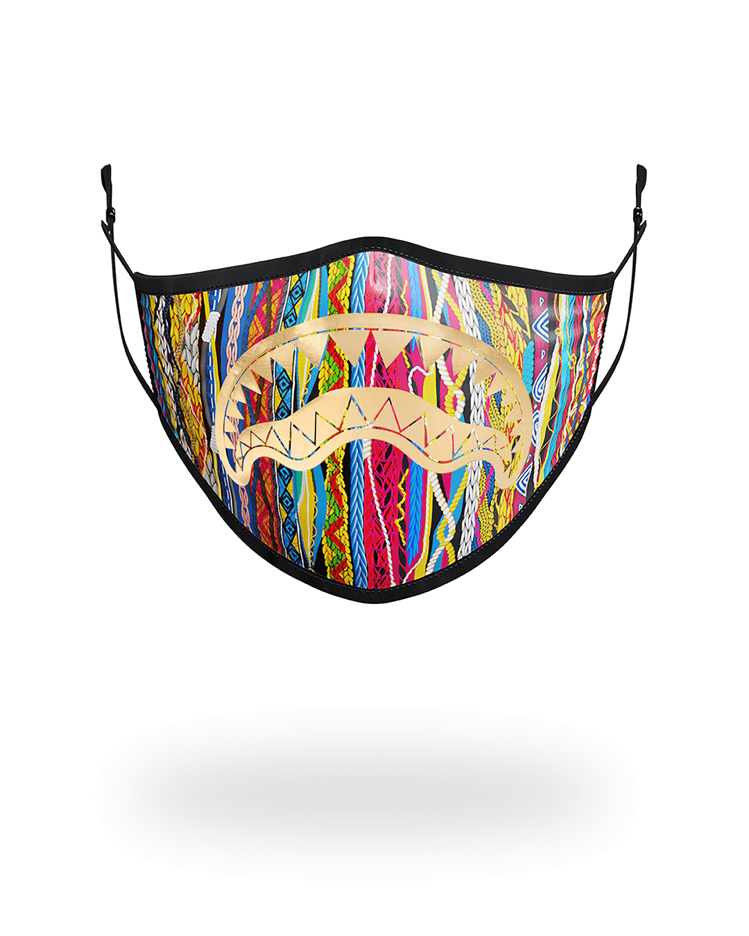 [split] METALLIC GOLD PRINTED SHARKMOUTH POLYESTER & SPANDEX FABRIC WITH 3 LAYERS OF COMPLETE FILTRATION PROTECTION. FOUR WAY ELASTIC EAR LOOP STRAP WITH ADJUSTABLE FASTENER FOR THE PERFECT FITNOSE BRIDGE: BENDS FREELY...